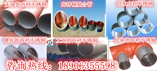 不銹鋼復合管由不銹鋼(不銹鋼316L、316、304、201、430和耐腐蝕合金管、銅基合金、鎳基合金、哈氏合金、鈦、鈦合金、雙相不銹鋼)和碳素結構鋼(Q195-235焊管,螺旋管、無縫管、鍍鋅管、合金鋼等碳鋼)兩種金屬材料,采用高科技無膠無損壓力同步復合技術、雙螺旋溫滾壓復合技術和靜水壓式復合技術,內襯不銹鋼復合管由于在兼顧了內外兩層管材的優點的同時也克服了它們的缺點,生產工藝簡潔、生產效率高,不銹鋼與碳鋼完美地合二合一。內襯不銹鋼復合管主要特點、優點:一、良好的機械性能。二、超高的結合強度。三、防銹耐腐蝕性好。四、耐溫性能佳,耐溫范圍-40~150℃,冷熱兩用。五、通徑大、阻力小。六、工作壓力高。七、全金屬結構強度高、衛生性能好,符合CJT192-2004標準要求。八、性價比高。九、安裝便捷,施工工藝簡單。產品特點為:擁有良好的機械性;耐酸耐堿耐腐蝕性好;復合結合強度高;耐熱耐寒,冷熱兩用;工作壓力高;具有良好的加工性能、可彎曲、焊接/法蘭連接、螺紋連接(絲扣連接、溝槽連接(卡箍連接連接)安裝便捷,工藝簡單;衛生環保、安全性好。